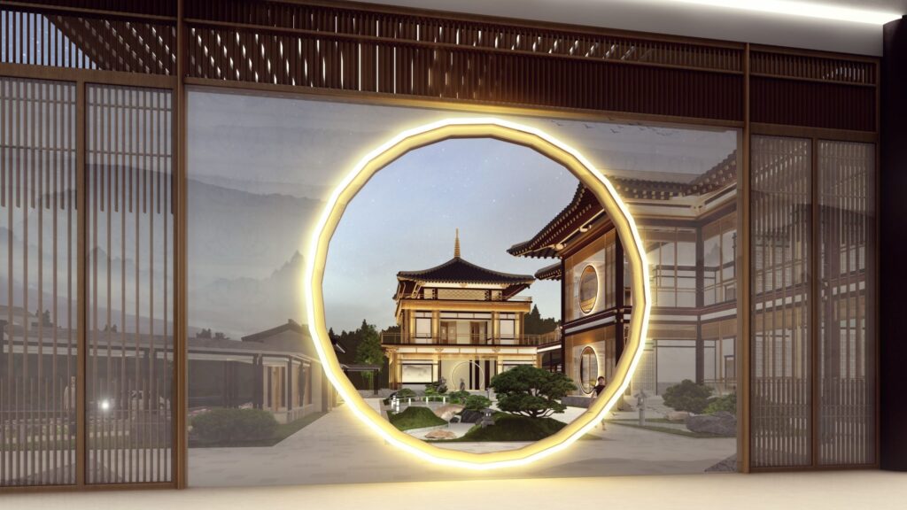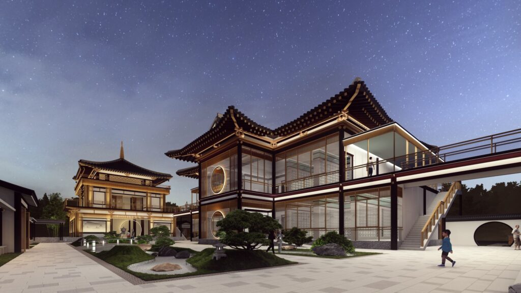 此风景墓园以中国传统文化为主轴,赋予艺术化设计、绿化园林风格,强调建设与自然和谐,优雅环境。墓园最大特色是仿效中国古代建筑,庭院设计阔绰疏朗,建筑精美雅致,代表建筑有明宫、唐城、百孝林。